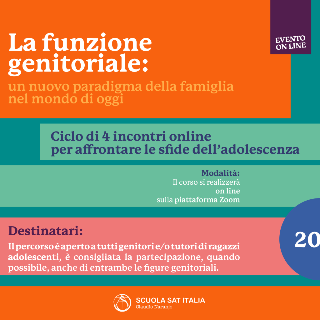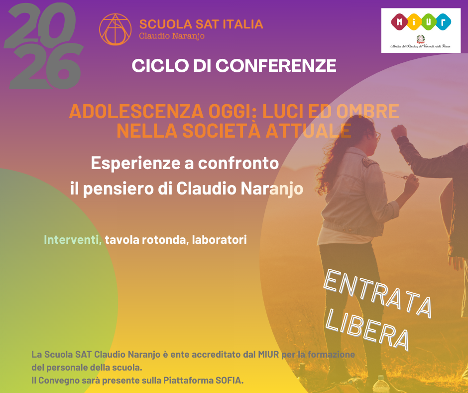 Adolescenza oggi: luci ed ombre nella società attuale Esperienze a confronto, il pensiero di Claudio Naranjo Interventi, tavola rotonda, laboratori BOLZANO-MODENA-NAPOLI-TARANTO Evento Gratuito – previa registrazione Un’ iniziativa volta ad esplorare e approfondire le molteplici sfaccettature dell’adolescenza alla luce del pensiero di Claudio Naranjo. Uno spazio di dialogo e riflessione, rivolto a genitori, educatori, professionisti […]