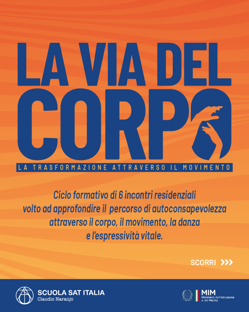 LA VIA DEL CORPO Trasformazione attraverso il Movimento Ciclo formativo di 6 incontri residenziali che si rivolge a coloro che sono interessati ad approfondire il percorso di autoconsapevolezza attraverso il corpo, il movimento, la danza e l’espressività vitale. La formazione prevede la presenza di professionisti del lavoro con il corpo, terapeuti psicocorporei/gestalt/bioenergetica e da professionisti […]