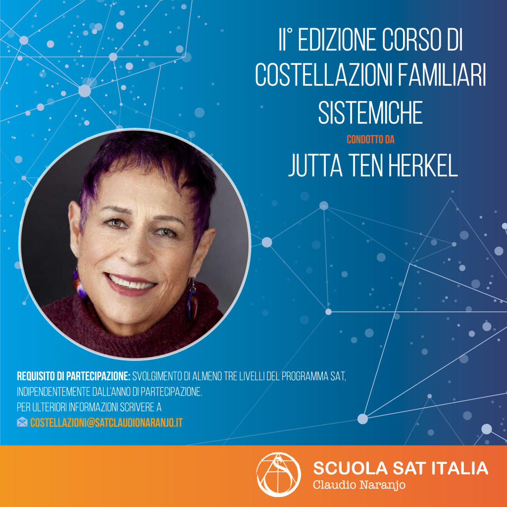 Corso residenziale Il percorso di Costellazioni Sistemiche integrate prevede 4 incontri condotti interamente da Jutta Ten Herkel, collaboratrice dalla Scuola Sat, allieva di Claudio Naranjo, terapeuta sistemico-familiare e costellatrice, formata con Bert Hellinger. Jutta Ten Herkel presenta in questo ciclo di incontri un’integrazione tra l’insegnamento di Claudio Naranjo volto alla conoscenza di sé […]